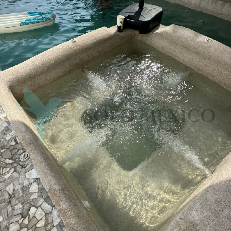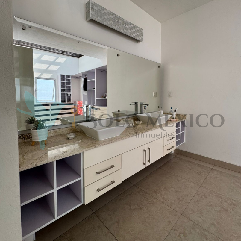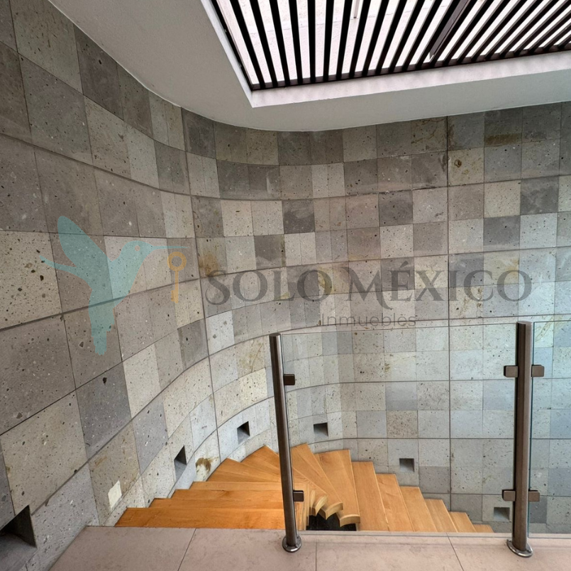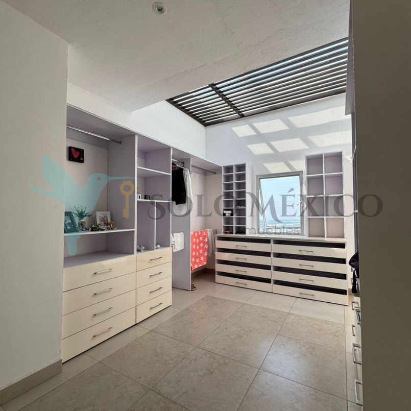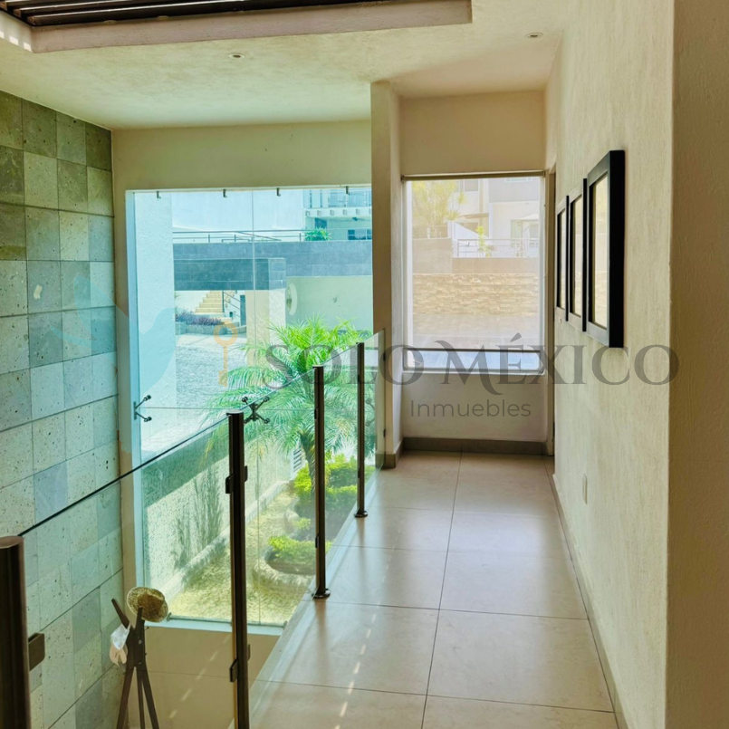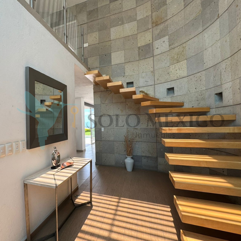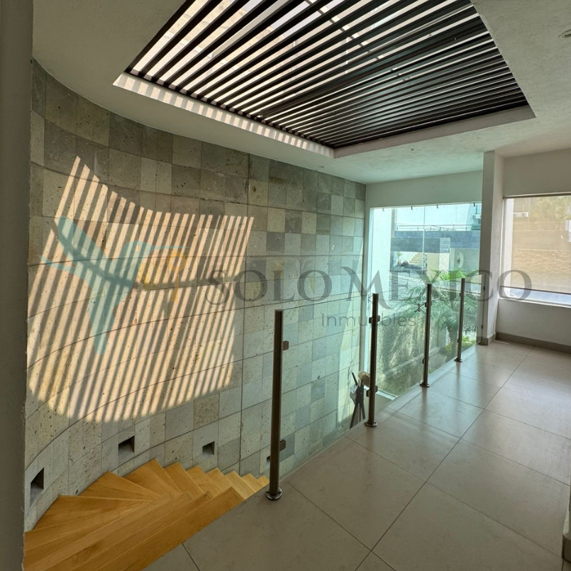 Cuenta con cuatro recámaras, todas equipadas con clóset, pantallas y persianas blackout. La recámara principal integra un vestíbulo privado, sistema de persianas a control remoto y baño equipado con cabina de vapor. El acceso principal cuenta con un recibidor a doble altura, techo de vidrio templado y escaleras voladas de encino blanco. Cocina integral equipada con desayunador tipo isla. Amplio jardín con alberca y jacuzzi, climatizados mediante un sistema de celdas solares, y con cuarto de máquinas.